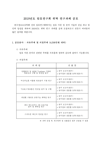 [KIISC] 2019년도 암호연구회 위탁 연구 과제 공모 (~12/21)